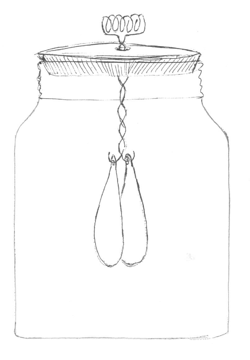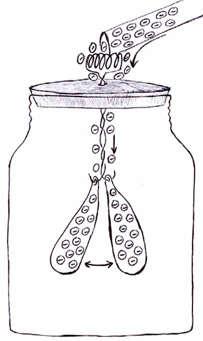 Nella parte centrale del tappo si fa un piccolo foro attraverso cui si farà passare un filo di rame (o altro conduttore) cui si può dare la forma che si vede in figura. Nella parte bassa del filo di rame si agganciano due foglioline di alluminio in modo che stiano una di fronte all'altra e che siano libere di oscillare nelle varie direzioni. Fatto ciò, si posiziona il tappo all'imboccatura del vaso e l'elettroscopio è pronto per essere usato. |